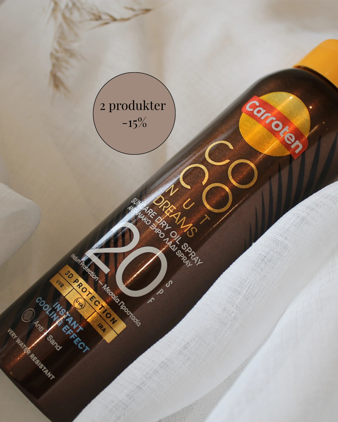 Coconut Dreams Dry Oil SPF 20/30 er din sommerfavorit, når du ønsker både smuk glød og effektiv solbeskyttelse. Med sit smarte 360° spraysystem er den nem at påføre – uanset vinkel – og ideel til stranden eller på farten.